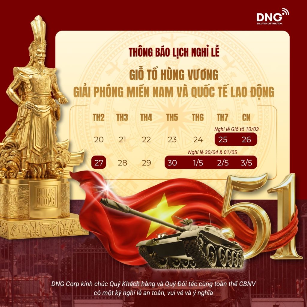 The historic month of April and the vibrant month of May are approaching, bringing with them a series of meaningful holidays. DNG Solutions Distribution Joint Stock Company (DNG Corp) respectfully announces the holiday schedule for Hung Kings’ Anniversary and the Liberation of Southern Vietnam (April 30th) – International Labor Day (May 1st) holidays in 2026 as follows: