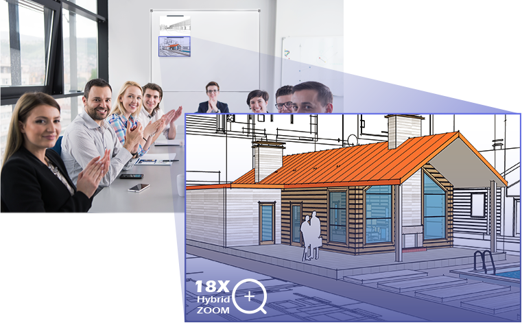 Nâng cao trải nghiệm cuộc họp trực tuyến video của bạn với VB350 công nghệ ống kính kép 4K. Tự hào với trường nhìn 113° và khả năng thu phóng hybrid zoom 18X, VB350 ghi lại những hình ảnh rõ nét về tiền cảnh và hậu cảnh trong phòng họp ở độ sâu lên đến 7 mét.
